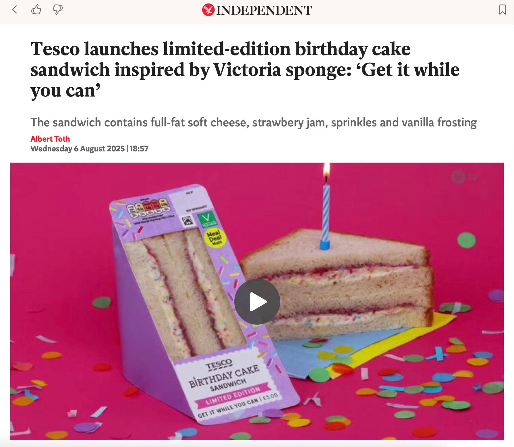 Remember that bonkers M&S strawberries and cream sandwich brought out in time for Wimbledon? Seems that Tesco have outdone their competition with their even more bonkers idea: a birthday cake sandwich. (I’d say that it knocks the Dutch chocolate spread sandwiches you’d mentioned in your letter into a cocked hat!)
