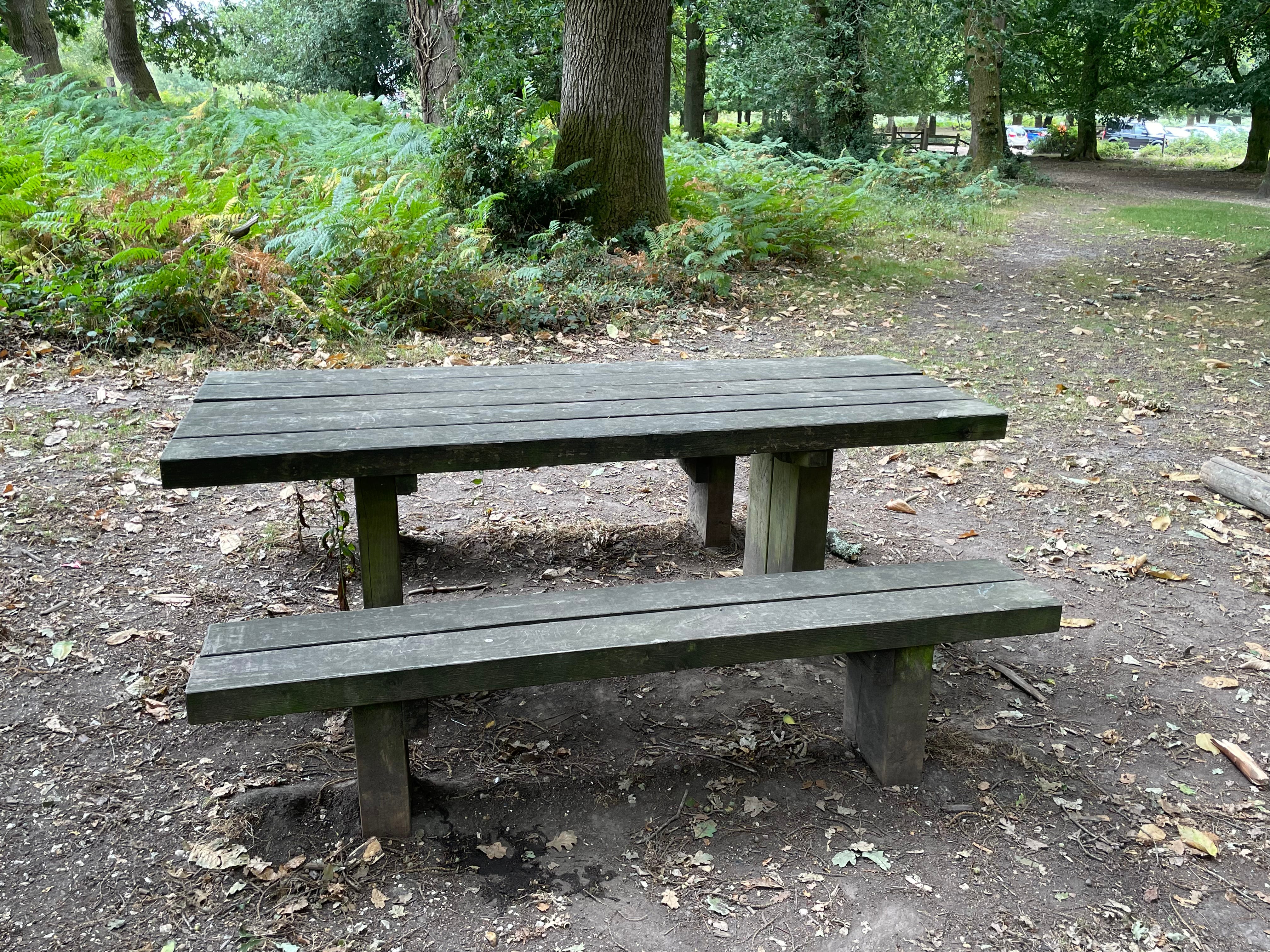 We stopped on the New Forest on our way in order to stretch our legs and have lunch, and at a picnic table in a sheltered spot we saw two ladies settling down to have theirs. They’d spread a tablecloth out, had a couple of large bags in front of them, and were busy setting out things that looked, well, not in the least bit like lunch!