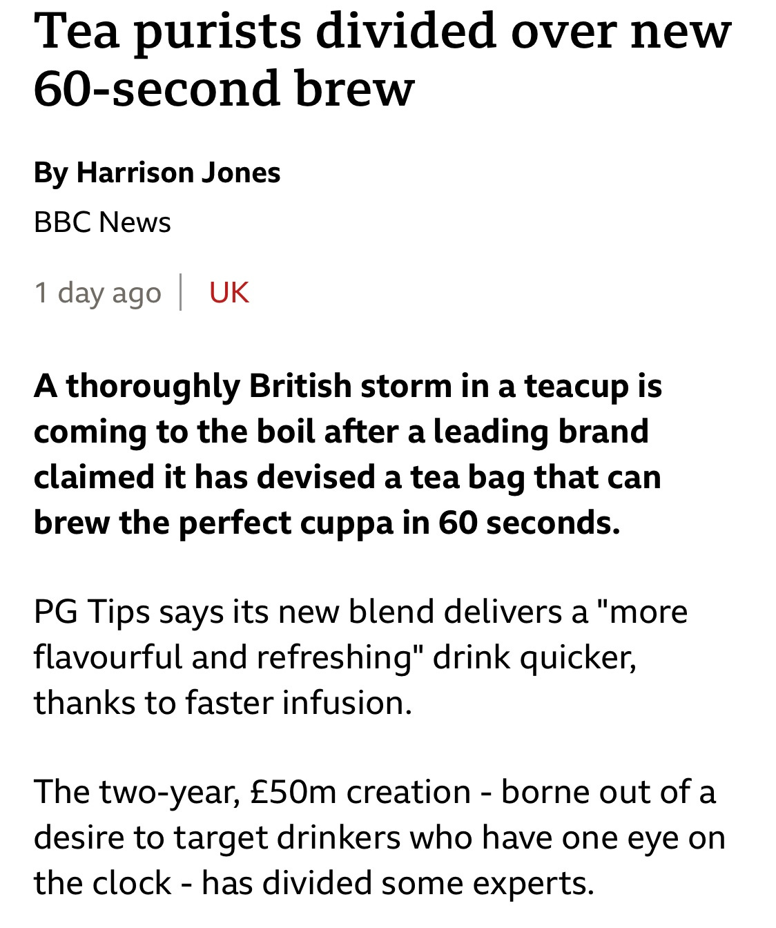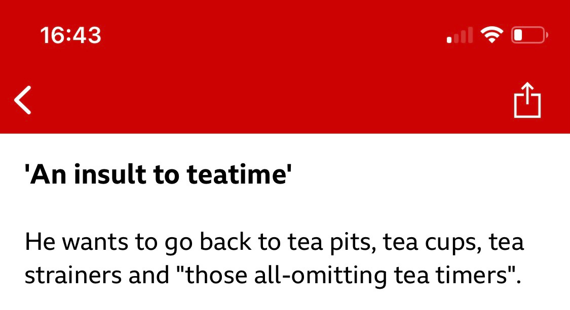 I was horrified when at peak cup-of-tea o’clock last Thursday – it was just gone 4pm – this story appeared on the BBC News app just as I was waiting for the kettle to boil: