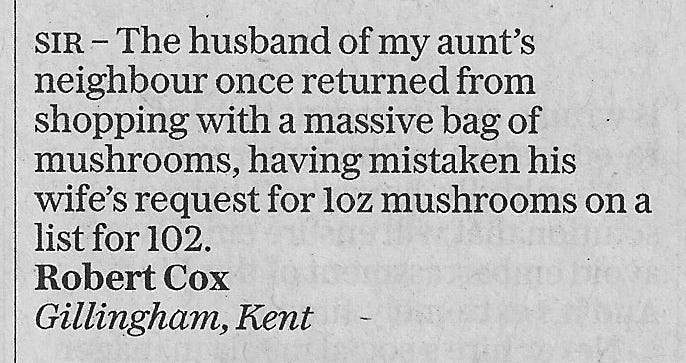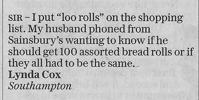 I’ve been entertaining myself by analysing another lost list these past few days, and during my habitual days-late catch-up with the Saturday Telegraph over my lunchbreak I was delighted to come across some correspondence about shopping lists. Here are two of my favourite letters to the editor: