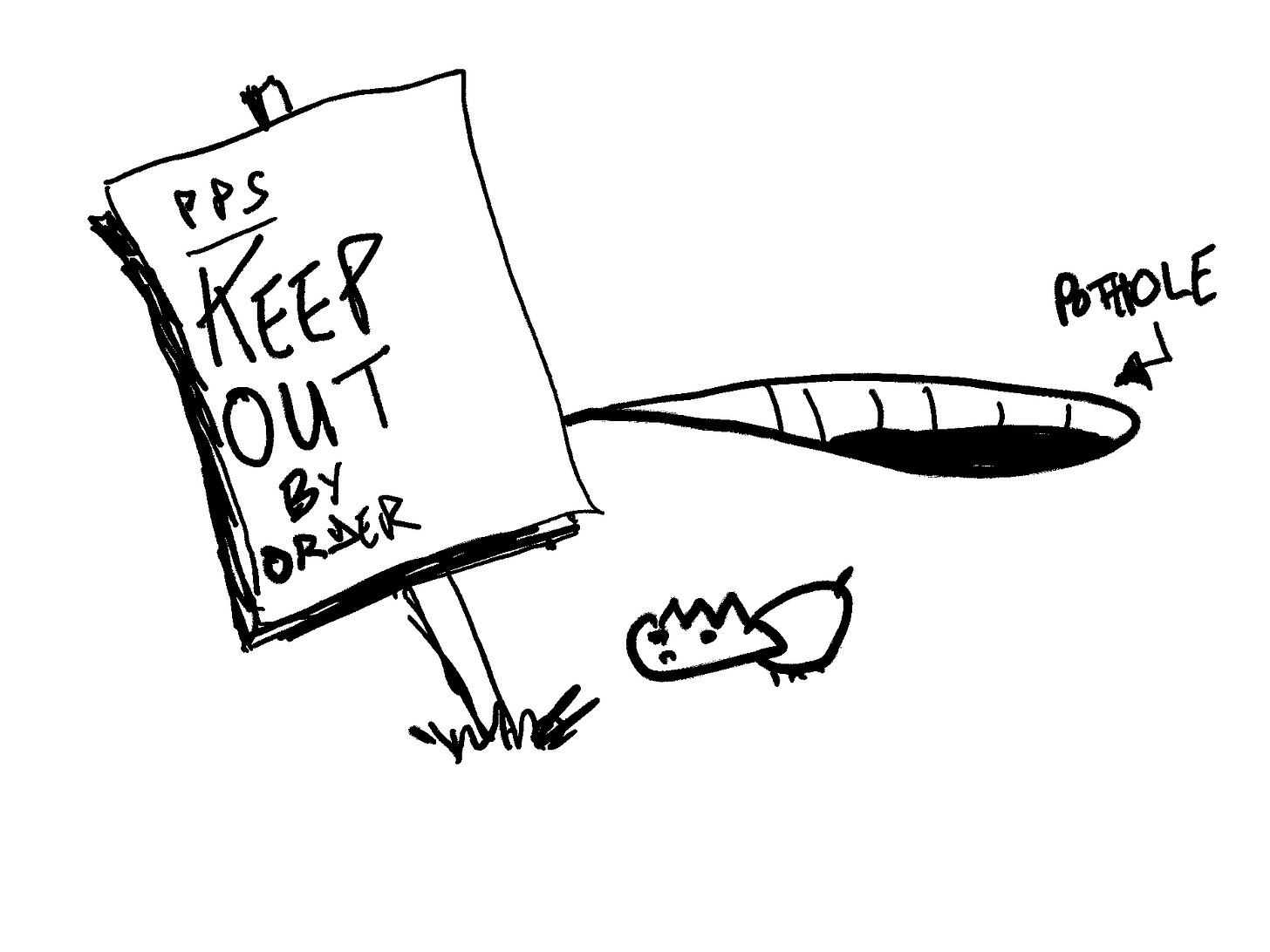 PPS: I fear – as evidenced by the ‘PPS’ at the top of the sign in your illustration below – that potholes remain a low priority. As such, any plans by those who are actually in charge of these things are, like this PPS, simply an afterthought. 😉